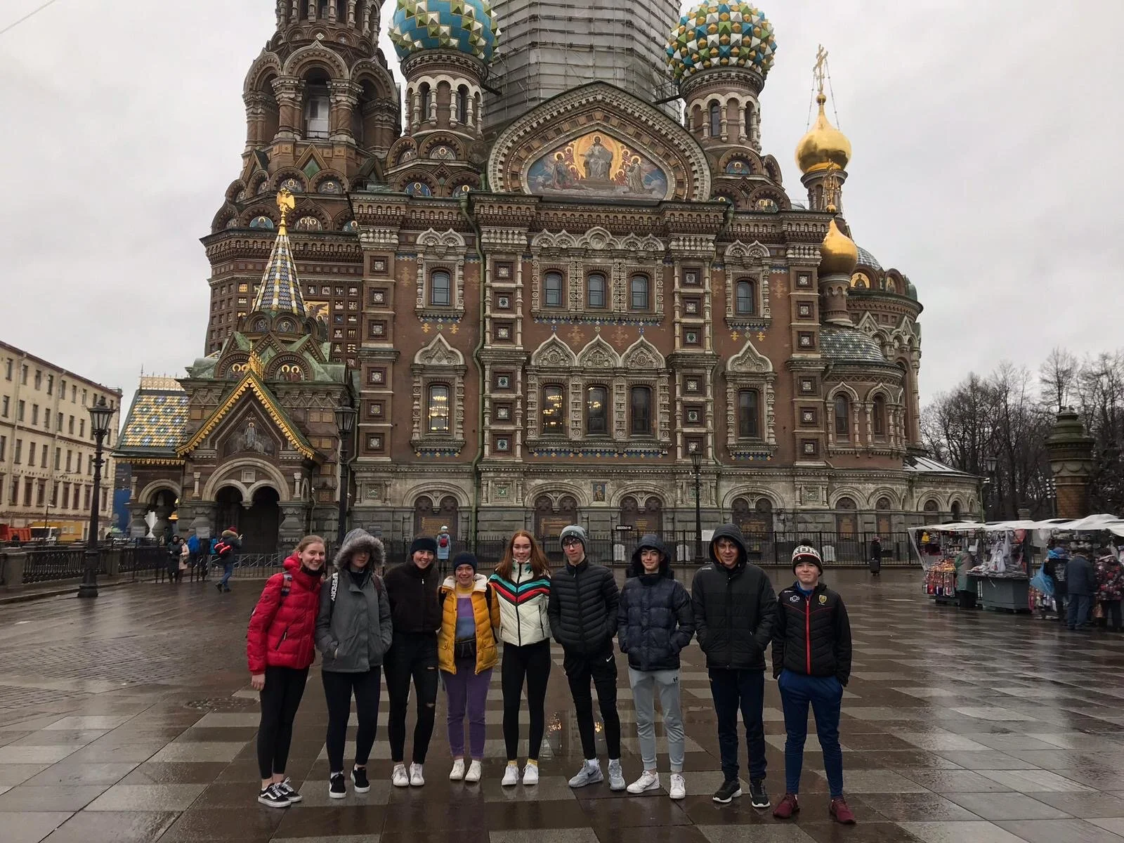 8 of our musicians and dancers outside the Church of the Saviour on Spilled Blood